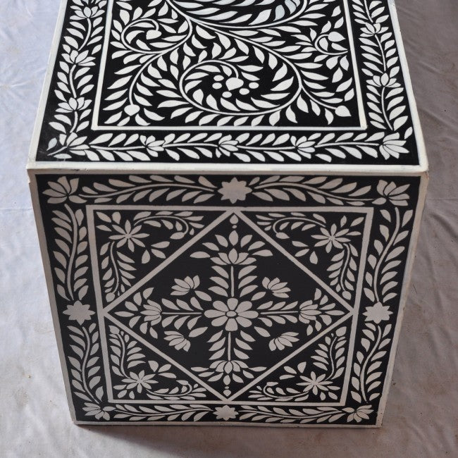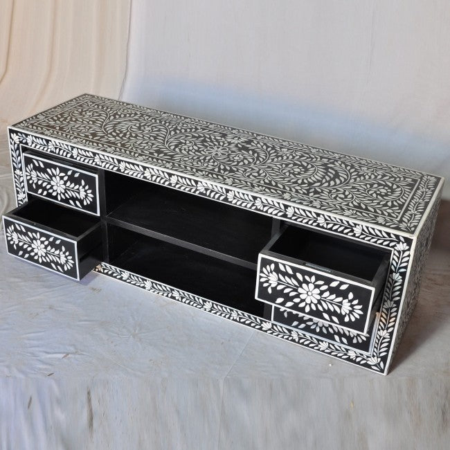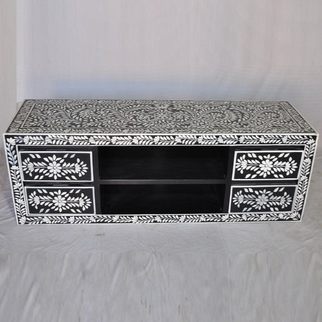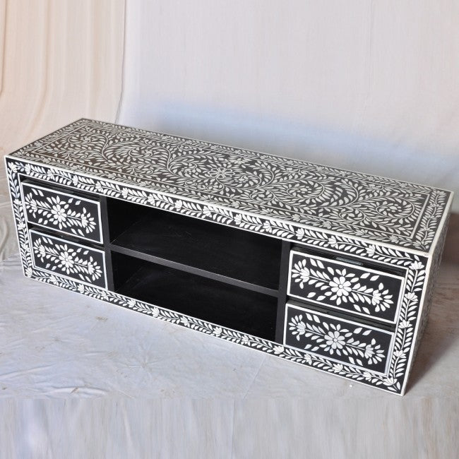 Bone inlay Floral Pattern Black Floral 4 Drawer TV Unit