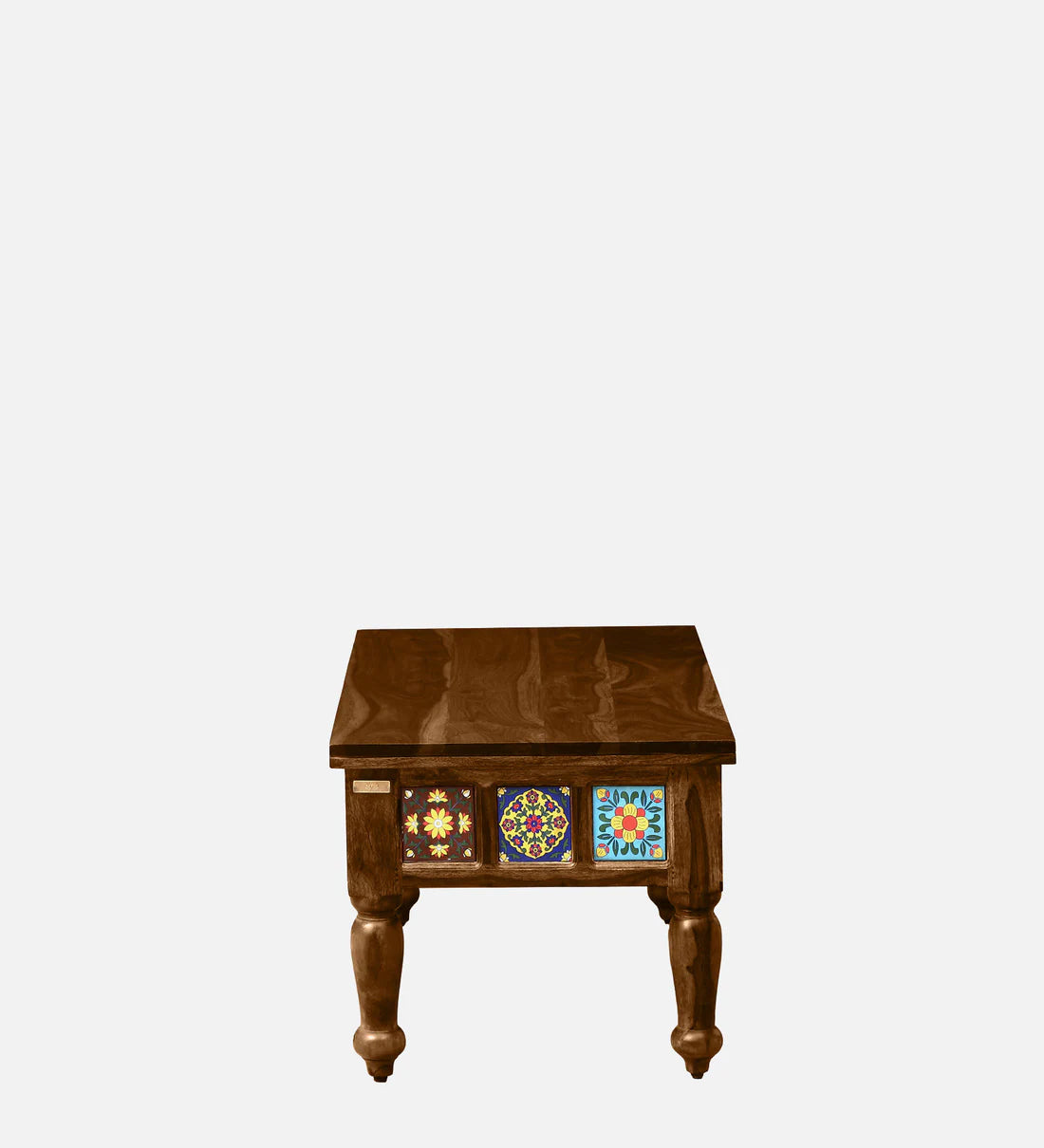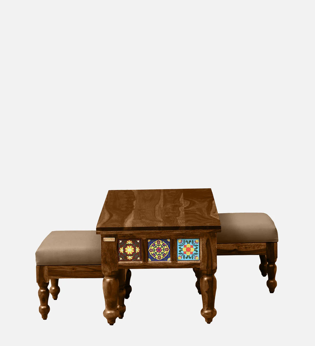 Shanti Surprise Sheesham Wood Nesting Coffee Table Set in Provincial Teak Finish With Cushioned Stools