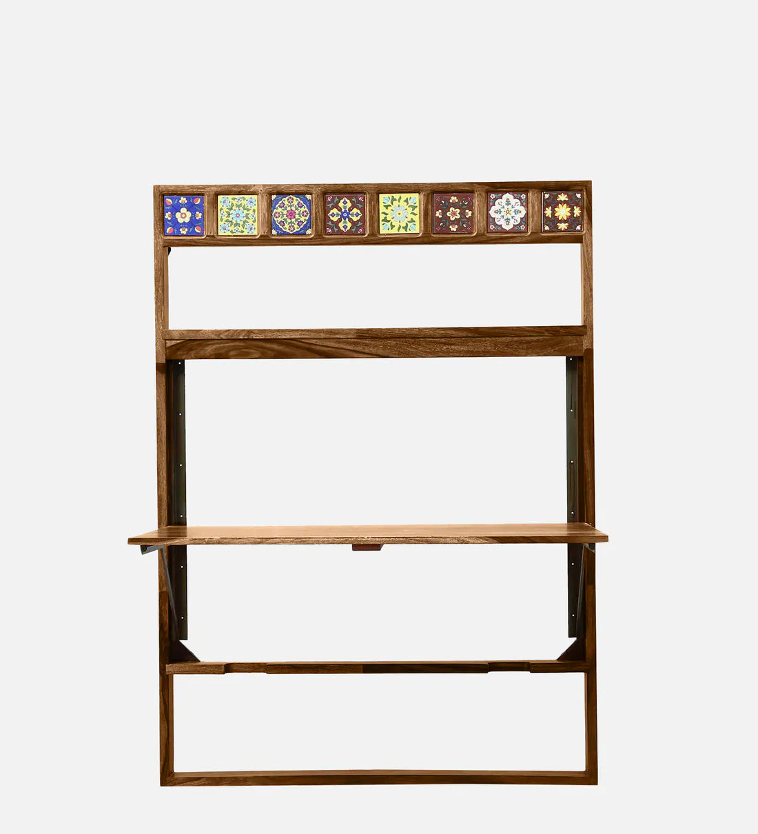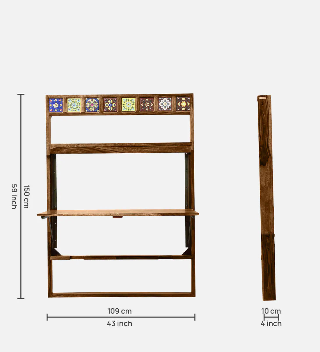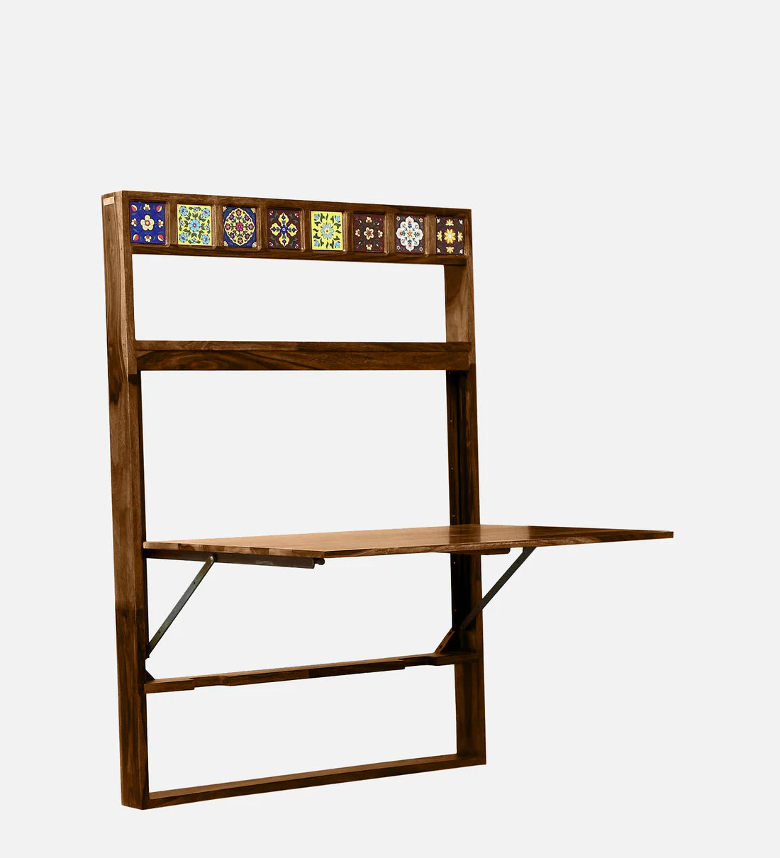 Moroccan Mosaic Mango Wood Wall Mounted Foldable 4 Seater Dining Table In Rustic Teak Finish