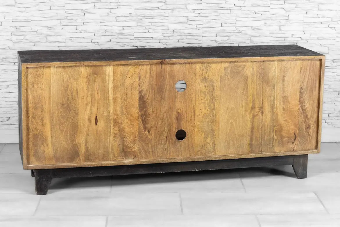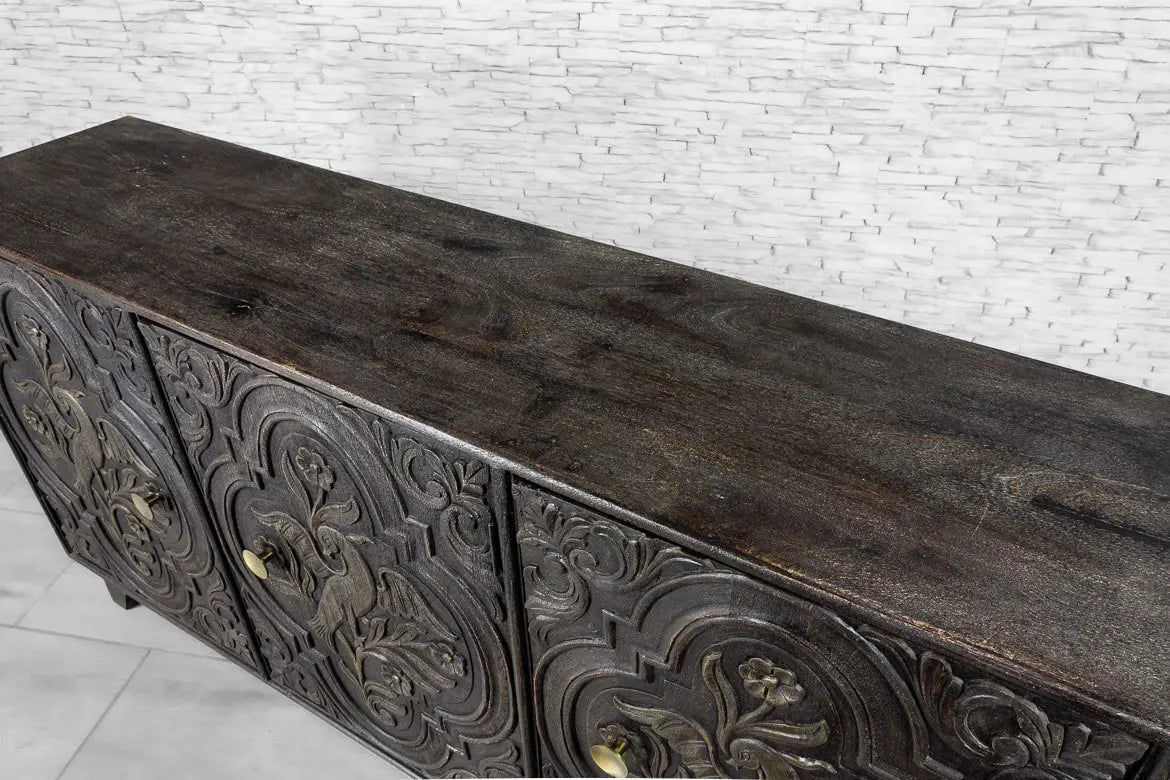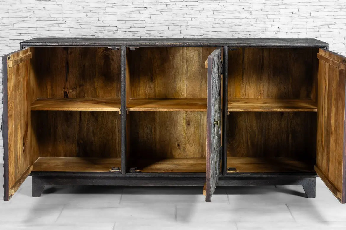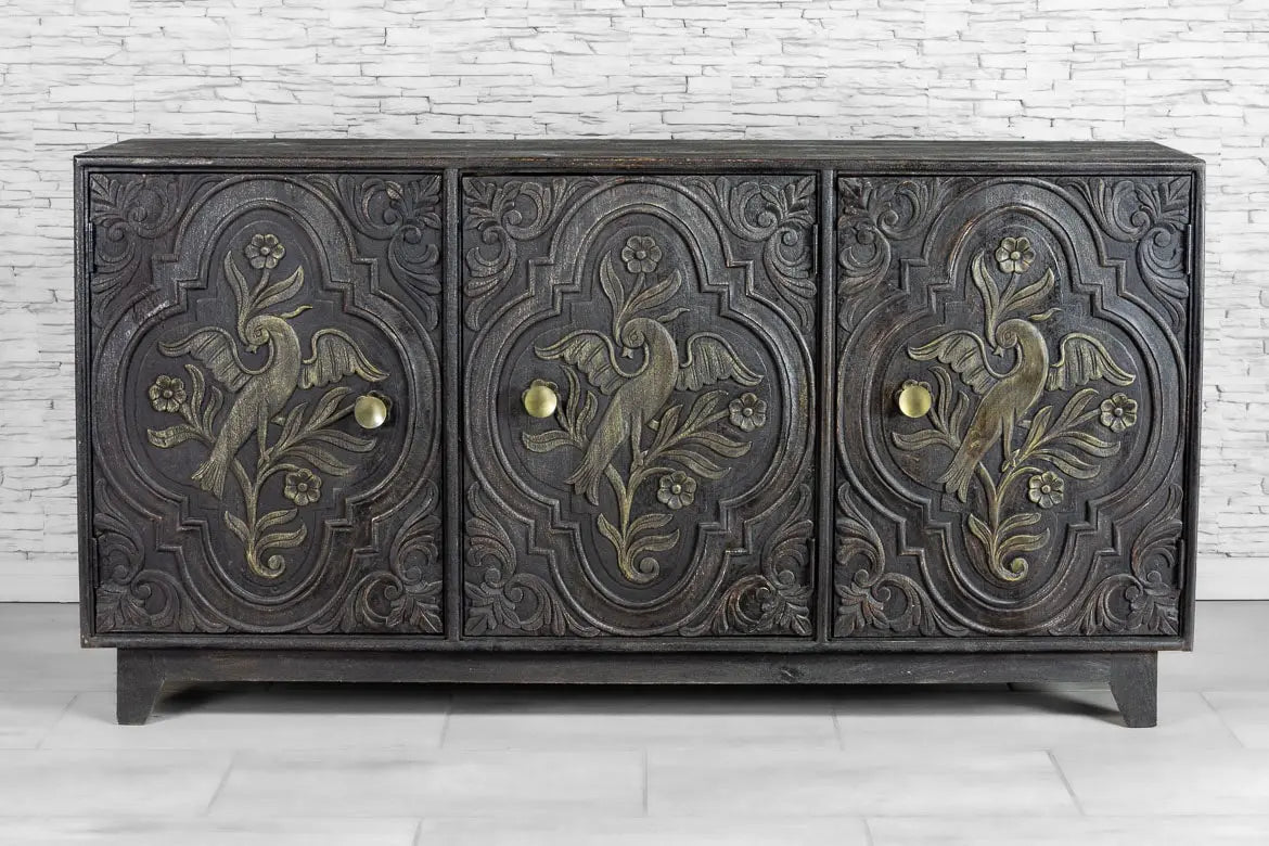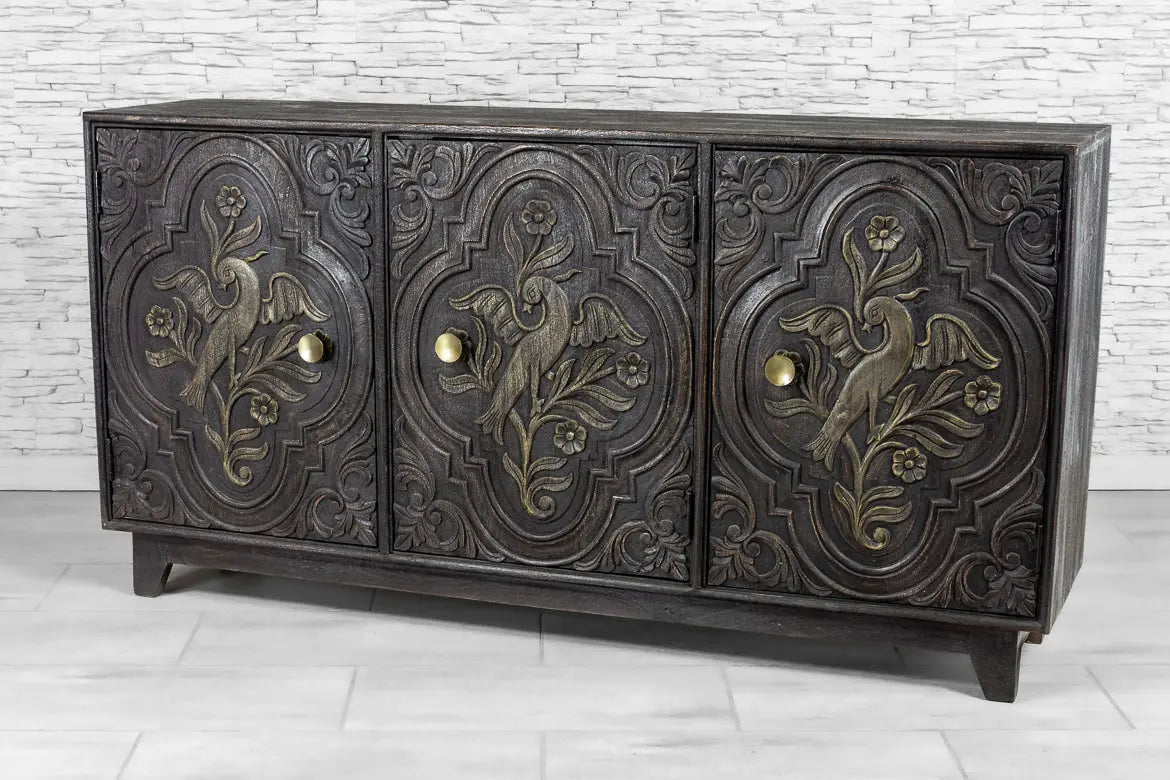 Urban Loft Handmade Solid Mango Wood Carved 3 Doors Sideboard in Black