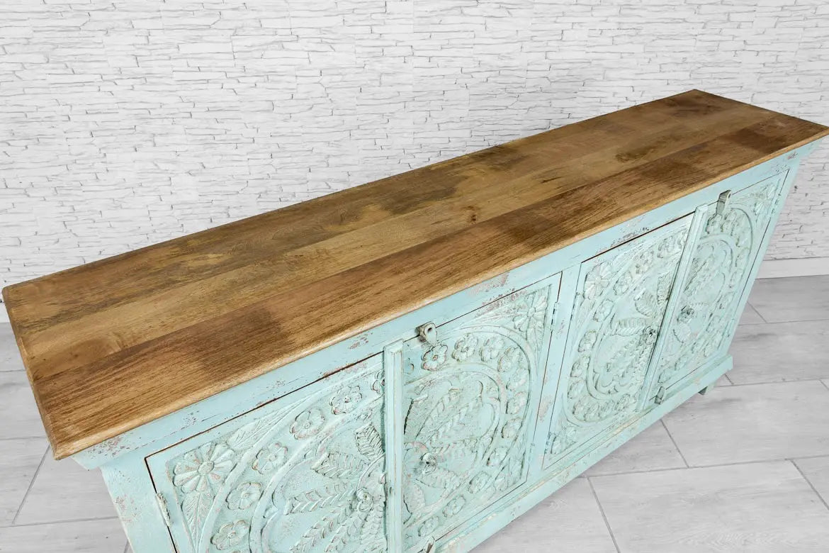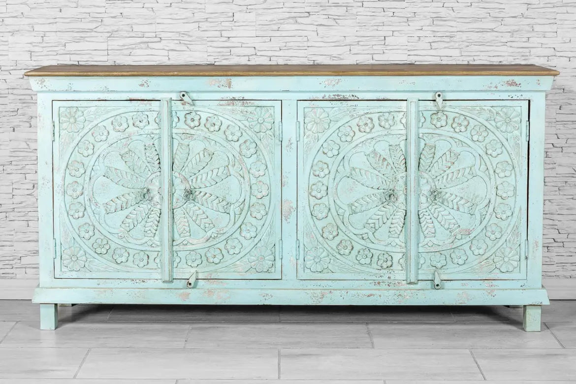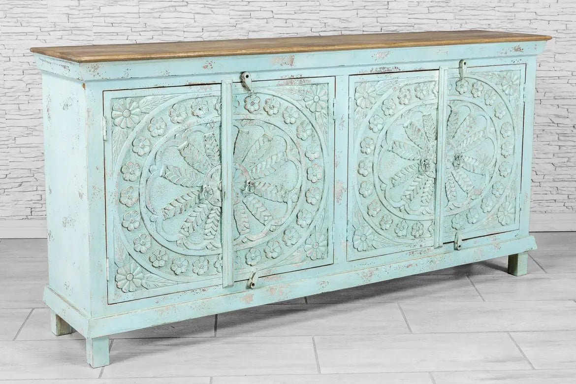Urban Loft Handmade Solid Mango Wood Carved 4 Doors Sideboard in Blue