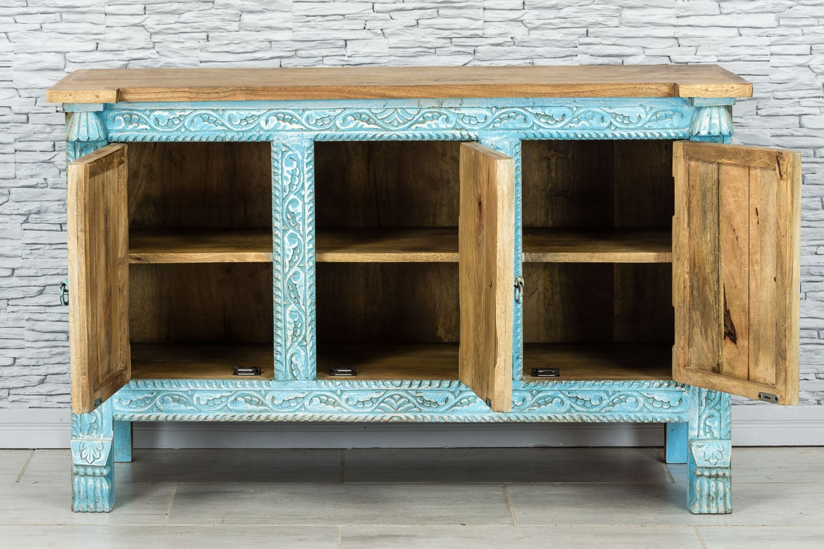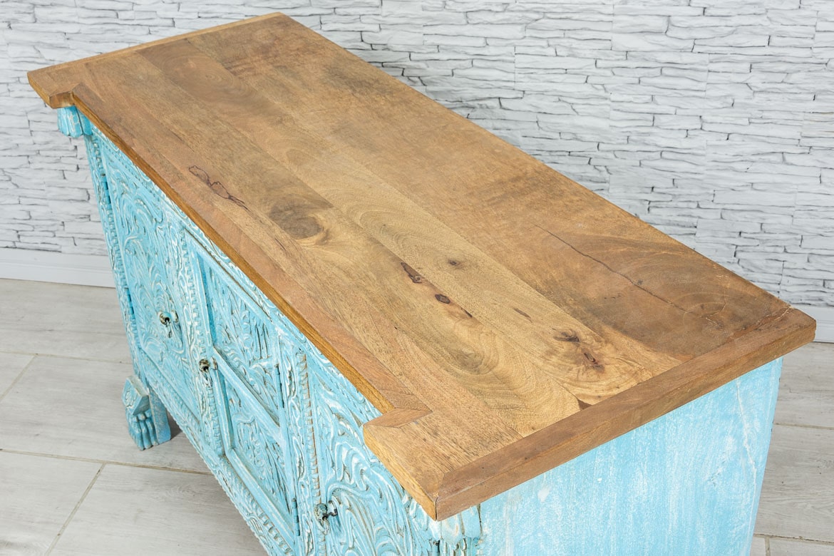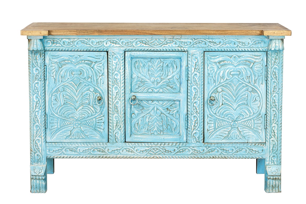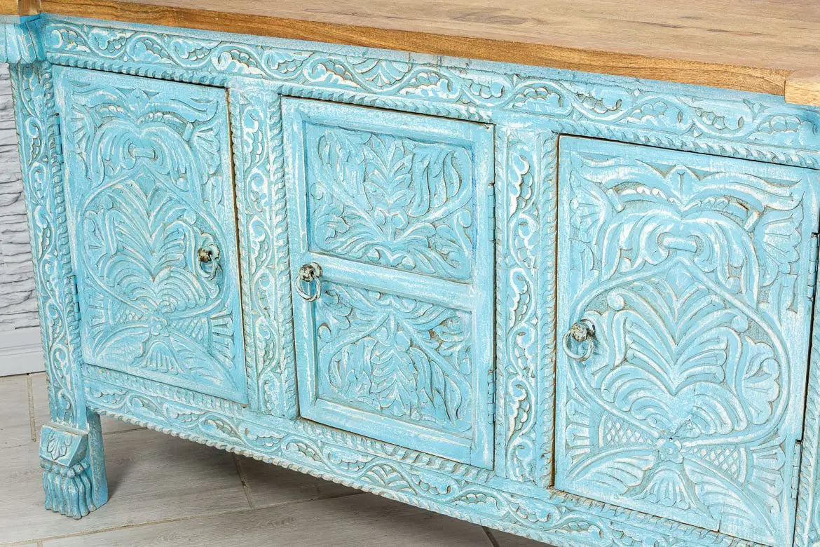 Urban Loft Handmade Solid Mango Wood Carved Sideboard in Rustic Blue