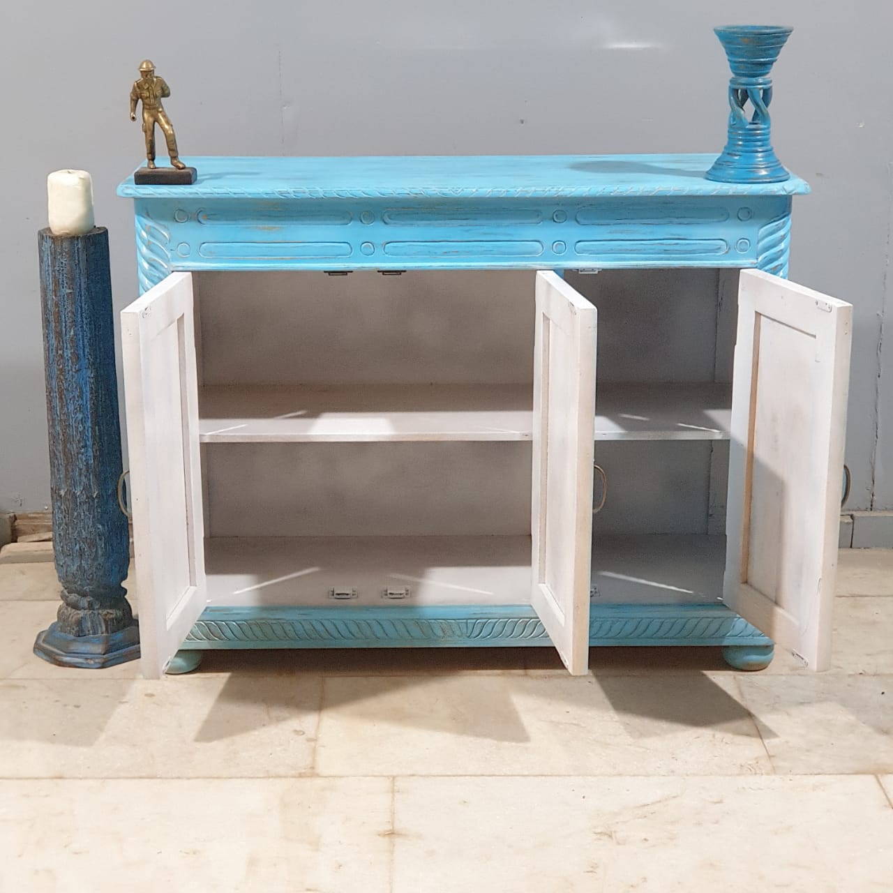 Vintage Hand Carved Solid Wood 3 Door Sideboard Blue